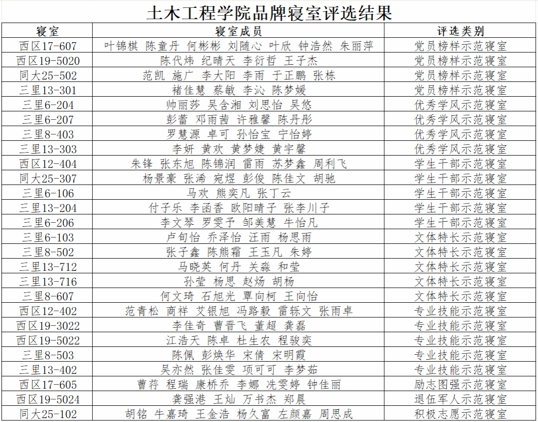 经过自主申报、材料审核等环节,最终评选出26间品牌寝室,以下为本次品牌寝室评选的获奖名单: