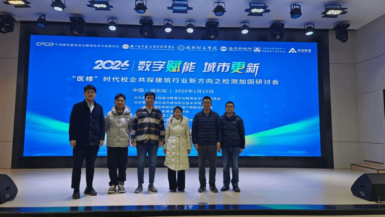 2026年1月10日,我院土木工程系李青、黄浩,工程造价系罗卓、赵正,智能建造系罗明星、邓庆、胡坚等老师一行七人赴武汉市湖北城市建设职业技术学院参加数字赋能城市更新—“医楼”时代校企共探建筑行业新方向之检测加固研讨会(湖北站),本次会议由中国建设教育协会教育技术专业委员会主办,绿色智能品质建造产教融合共同体、湖北建设教育协会、北京盈建科软件股份有限公司、中安集团等联合协办,会议聚焦建筑检测加固领域的数字技术应用与校企协同创新,旨在破解行业发展痛点、优化人才培养体系,为城市更新背景下既有建筑安全保障事业注入新动能。