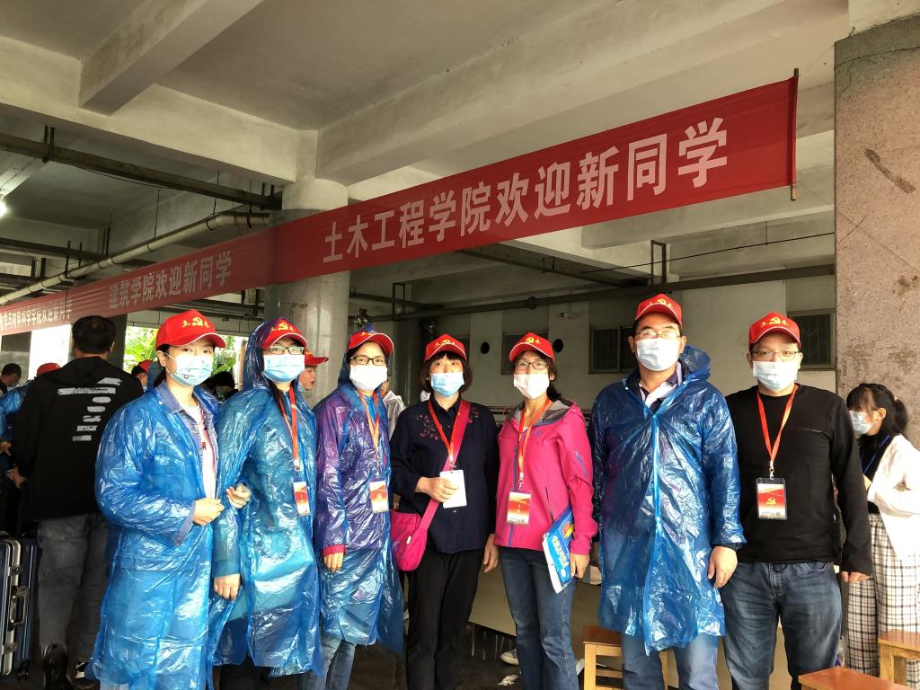 为帮助2020级新生顺利完成开学报到,英国上市公司365在院长李晓目和党总支书记童友枝带领下,积极组成师生党员志愿服务队,在9月20日新生开学报到的第一天,冒着凉风细雨,到图书馆迎新点,迎接我院新生。