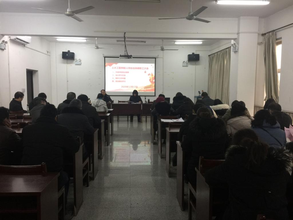 党总支书记童友枝同志主持开展了2020年度评优评先民主推荐工作。副院长郭波同志就湖北省新工科背景下土木工程专业“教育教学协同育人”人才培养体系构建与实践研讨会参会学习情况进行了交流。院长李晓目同志对期末教学工作进行了安排布置,同时通报了我院2020年度目标管理自评的基本情况,李院长要求广大教师加强团队合作,做好各项工作。