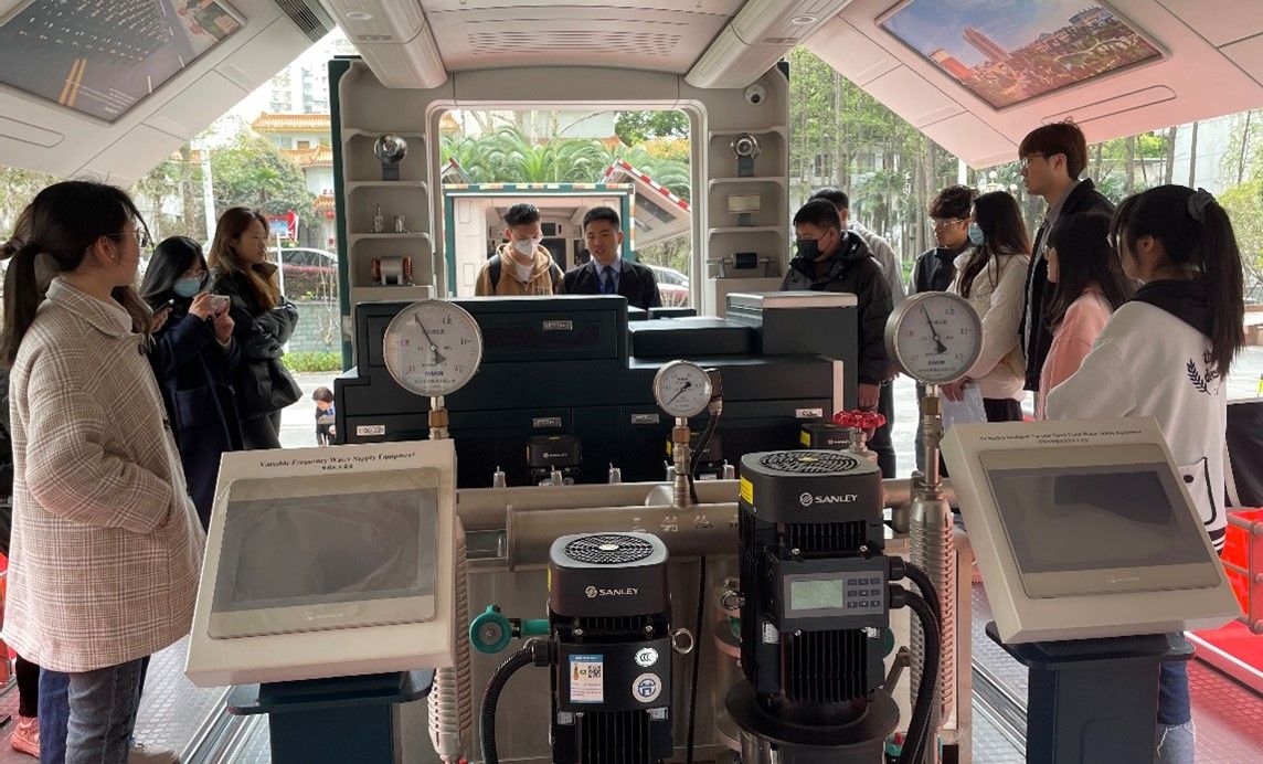会前,同学们登车参观了三利集团布设的产品展示车,围绕全系列水泵、五位一体直饮水、智慧水务与智慧泵房、房车、样机车、中开双吸泵、三利机器人等产品,从不同角度了解了三利新技术和产品的精细化、智能化、集成化。