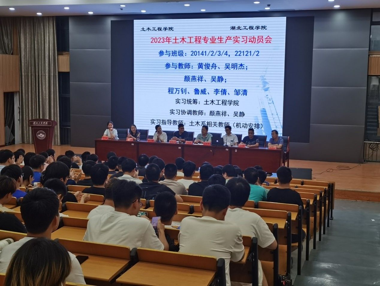 2023年6月19日晚在天成楼315报告厅,土木工程系召开土木工程专业生产实习动员大会。工程实践和社会服务专家、优秀教师代表黄俊舟老师,建筑学系主任吴明杰,土木系支部书记吴静,土木系主任颜燕祥,土木系大三年级班主任鲁威老师、李倩老师、程万钊老师、邹清老师及各实习班学生221人参加此次大会,会议由土木系支部书记吴静主持。