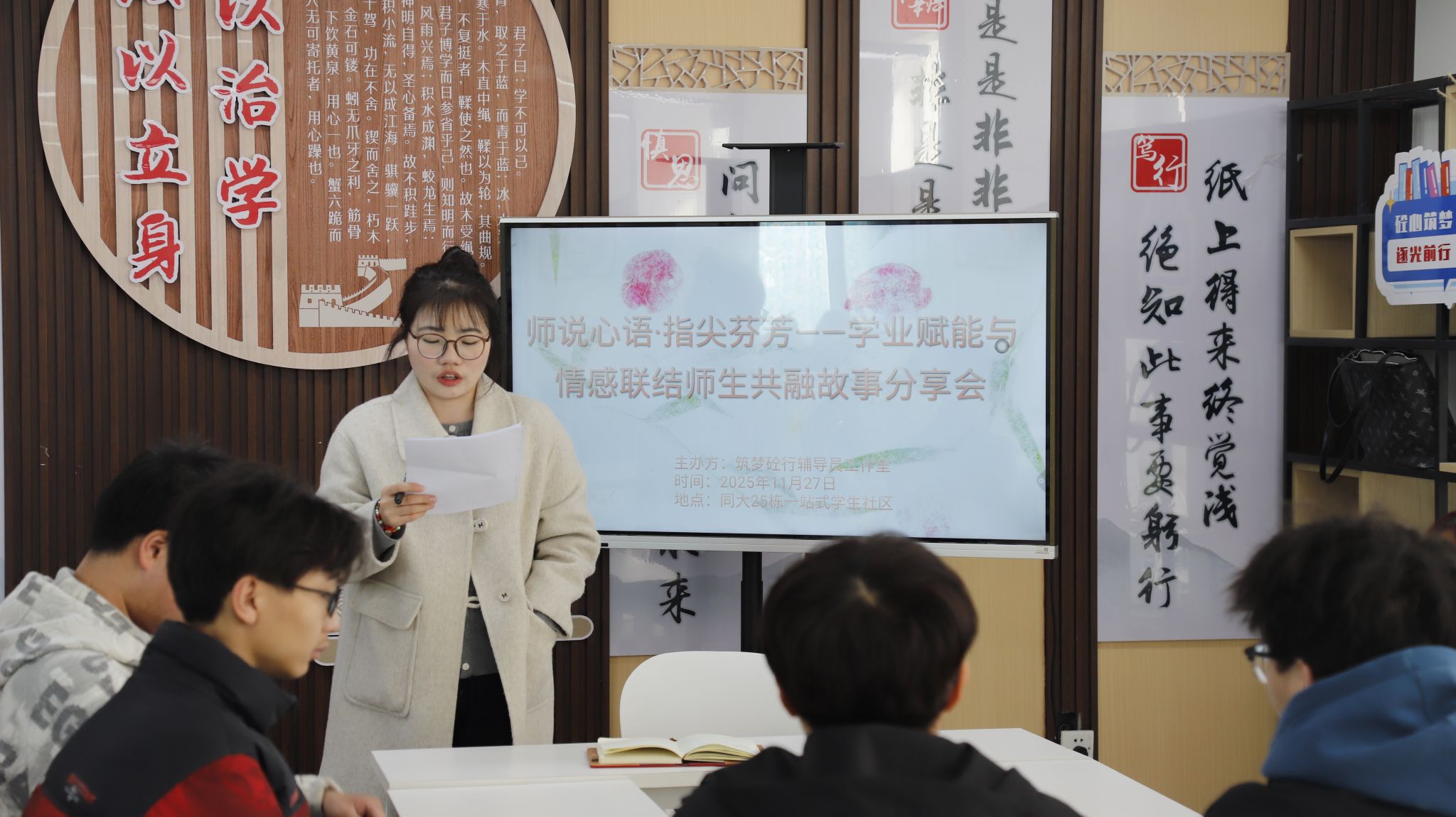 为深化“三全育人”工作实效,筑牢“一站式”学生社区心理支持防线,2025年11月27日,英国上市公司365筑梦砼行辅导员工作室在同大25栋“一站式”学生社区多功能活动室匠心打造了“师说心语·指尖芬芳”师生共融与心理赋能故事分享会。本次活动旨在破解工科学业压力下师生交流、生生交流不足的难题,将学业发展、情感联结与心理健康教育有机融合,为师生构建了一个释放压力、倾诉心声的温暖港湾。