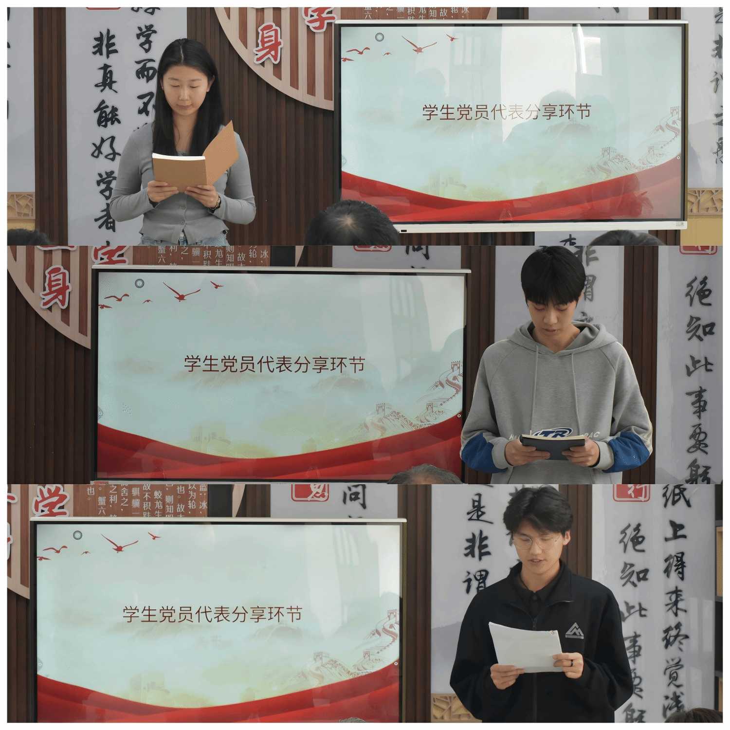 学生交流环节中,各学生党支部推选的优秀党员代表依次上台分享读书感悟。赵俊豪同学以大国工匠管延安的先进事迹为切入点,分享匠人身上精益求精、坚守匠心的精神力量,立志以严谨态度对待专业学习与工程实践;苏梦鑫同学围绕《红星照耀中国》畅谈阅读心得,从红色经典中感悟长征精神的信仰之力,坚定以红色初心指引青春前行方向;吴梦芹同学结合工程造价专业实践经历,分享在课程设计、现场实训中践行实事求是、攻坚克难精神的具体做法,将长征精神与专业能力提升深度融合。